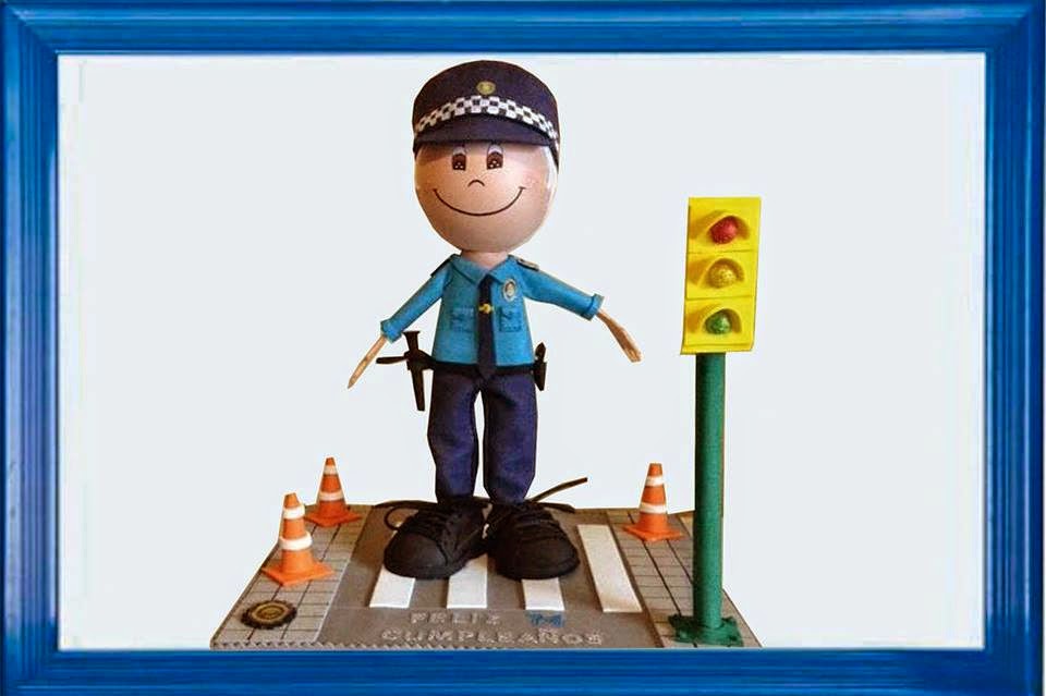 Éste fofucho me lo pidió un amigo para regalarselo a su padre por su cumpleaños. Ya está jubilado, toda su vida ha sido policia local, asi que su hijo lo quiso representar en la calle sobre paso de peatones regulando la circulación, lleva los conos, el semaforo , vestido con su uniforme y todos los detallitos.